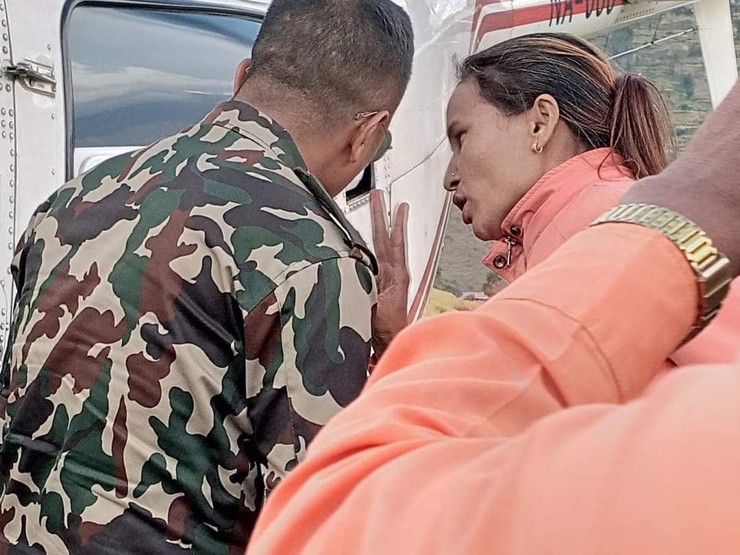 कालिकोट – सुत्केरी हुन नसकेर मृत्युकाे मुखमा पुगेकि शान्नि त्रिवेणी गाउँपालिका निवासी दाना कामिलाई हेलिकप्टर मार्फत उद्वार गरिएको छ ।